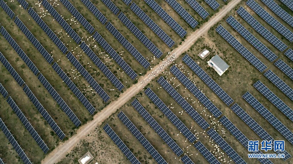 羊群在青海省海南藏族自治州共和县光伏产业园吃草(2019年6月16日摄,无人机照片)。 新华社记者 吴刚 摄
