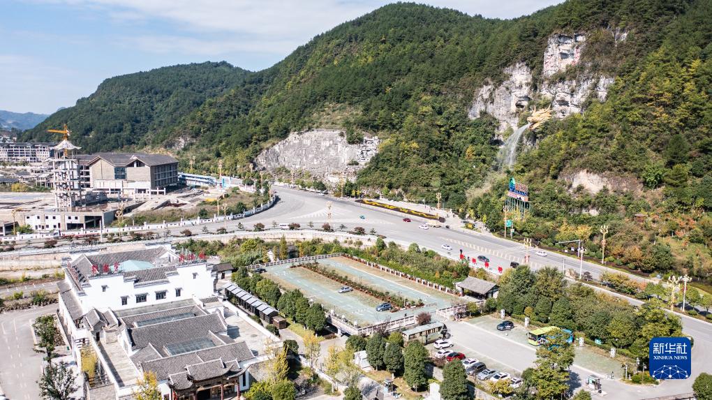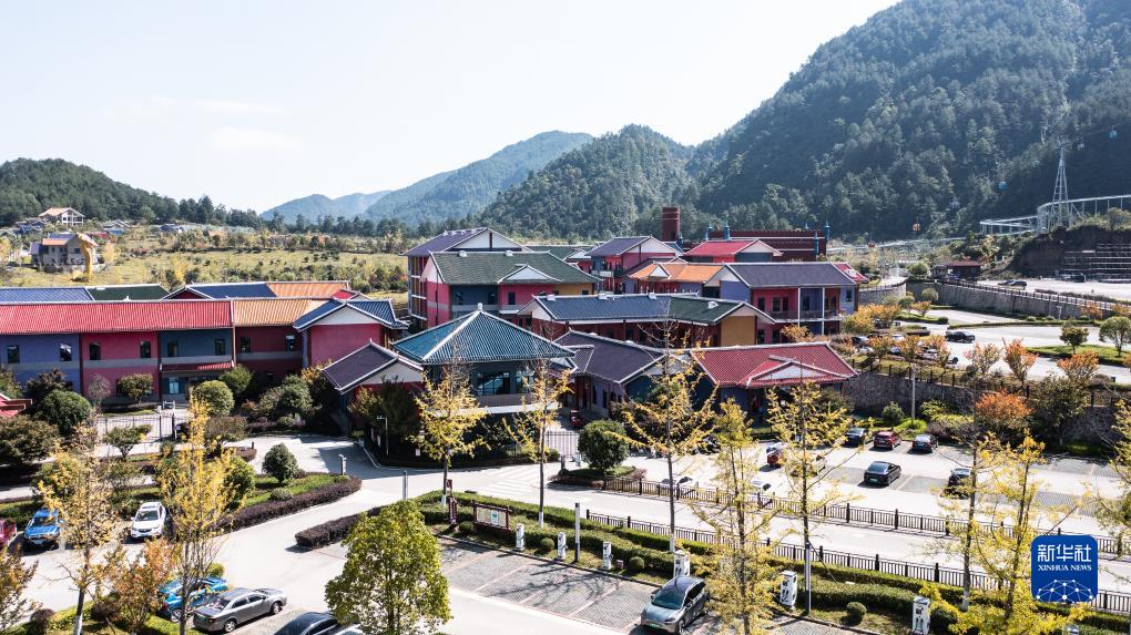 新能源汽车在黔南布依族苗族自治州龙里县龙山镇的充电桩设施充电(图右下)(10月17日摄,无人机照片)。 新华社记者 陶亮 摄