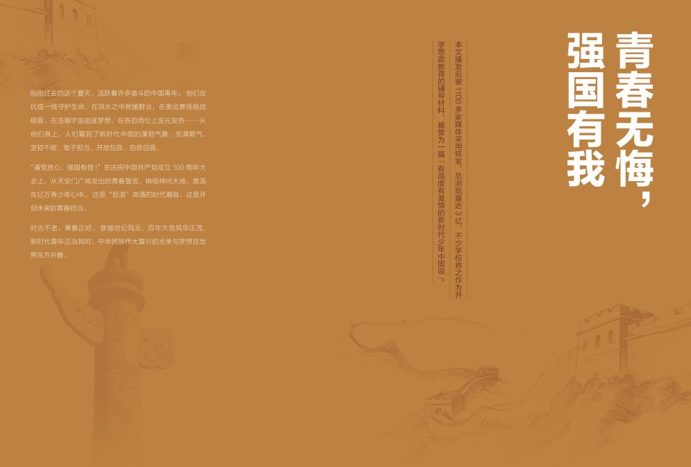 《青春无悔,强国有我》播发后被1100多家媒体采用转发,总浏览量近3亿,不少学校将之作为开学思政教育的辅导材料,许多青年和青年工作者在朋友圈转发,文章被誉为一篇“有高度有激情的新时代少年中国说”。