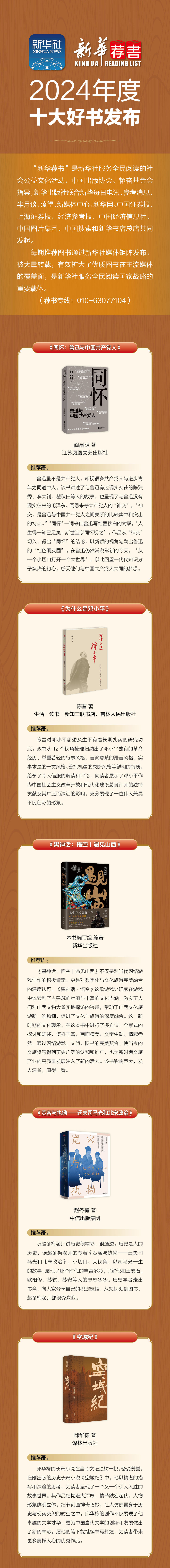 “新华荐书”是新华社服务全民阅读的社会公益文化活动,中国出版协会、韬奋基金会指导,新华出版社联合新华每日电讯、参考消息、半月谈、瞭望、新媒体中心、新华网、中国证券报、上海证券报、经济参考报、中国经济信息社、中国图片集团、中国搜索和新华书店总店共同发起。2025年4月初,结合网络投票结果,“新华荐书”评审委员会专家对2024年度“新华荐书”推荐图书及各大出版社报送的优秀图书反复评议,最终选出2024年度十大好书。