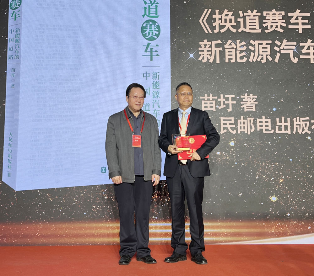 中央文史研究馆馆员、茅盾文学奖获得者张平(左)向人民邮电出版社执行董事、总经理李文颁发奖杯与证书