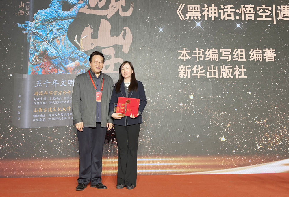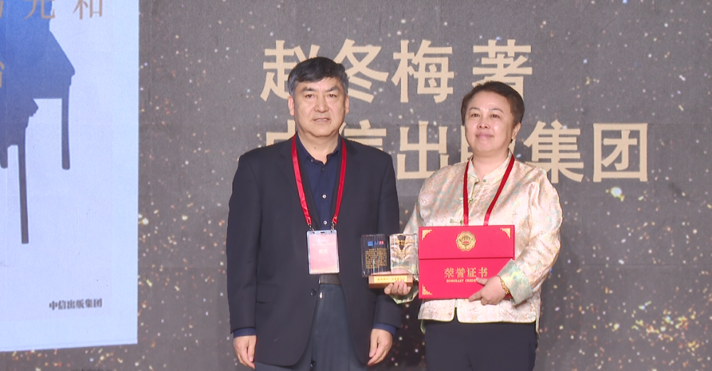 中国国际公共关系协会原副会长、中国外文局原常务副局长郭晓勇(左)向作家出版社总编辑张亚丽颁发奖杯与证书