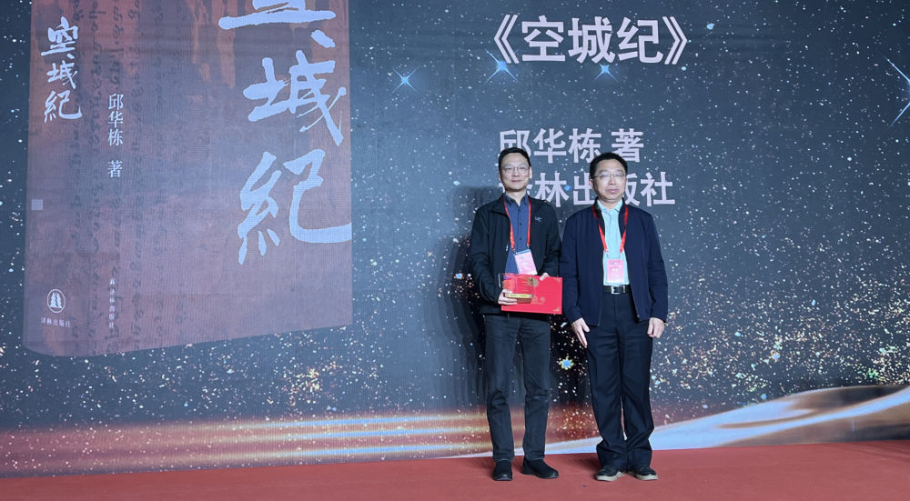 新华社原副社长兼常务副总编辑马胜荣(左)向江苏凤凰文艺出版社总编辑赵阳颁发奖杯与证书