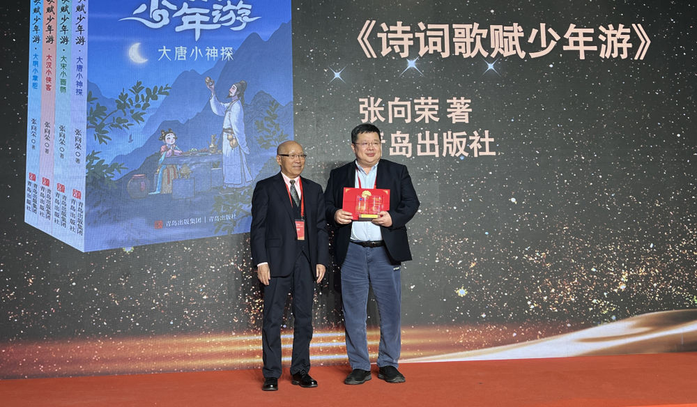 新华社原副社长兼常务副总编辑马胜荣(左)向青岛出版社副总编辑郭东明颁发奖杯与证书