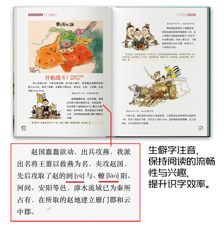 作为历史类图书,本书严格遵循史实脉络,结合《史记·秦始皇本纪》《史记·吕不韦列传》《史记·李斯列传》《淮南子》等经典史书创编,每一处都标注了故事出处,让孩子不但知其然,还要知其所以然。特邀秦始皇帝陵博物院学者进行审定,学术把关绝不马虎。文中成语加粗做了提示;生僻字注音,保持阅读的流畅性,提升识字效率。
