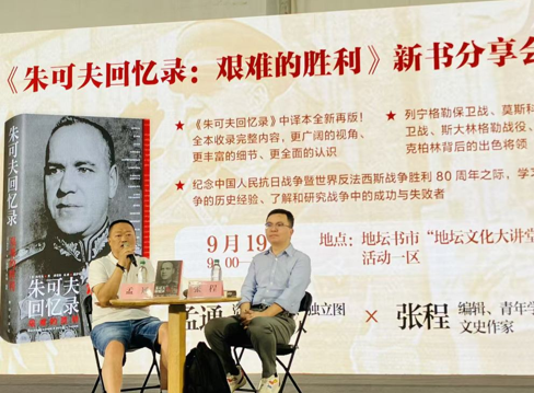 9月19日上午,新书《朱可夫回忆录:艰难的胜利》的编译者之一、资深媒体人、独立图书策划出版人孟通,与编辑、青年学者、文史作家张程采用对谈的方式,畅谈对朱可夫的理解以及对“二战”相关战役的历史解读。张程在分享中指出,苏联的卫国战争之所以是“艰难的胜利”,一方面体现了苏联的民族韧性,面对巨大的挑战,能够调动各方面的资源,发挥自己的优势投入持续的卫国战争;另一方面是反法西斯同盟国同心协力,共同投身反法西斯战争,最终在付出了巨大代价后才赢得了胜利。孟通在分享中介绍了这本书翻译的过程,着重介绍了《朱可夫回忆录》不同版本的区别,以及本次新版的特点。在与读者的分享过程中,两位嘉宾回答了《朱可夫回忆录》为什么会出现不同的版本、苏联卫国战争的历史影响与现实意义等问题。一个小时的分享,既有深度也有广度,有嘉宾自己的独到观点,也有现场观众与嘉宾的积极互动,取得了良好效果。
