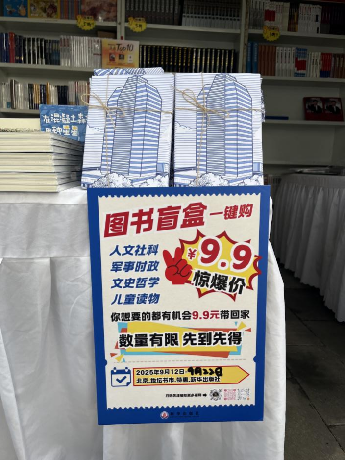 新推出的9.9元图书盲袋,蓝白配色的铅笔楼包装格外亮眼,图书涵盖人文社科、军事时政、文史哲学等,工作人员精心包装完一上架就被读者带走。