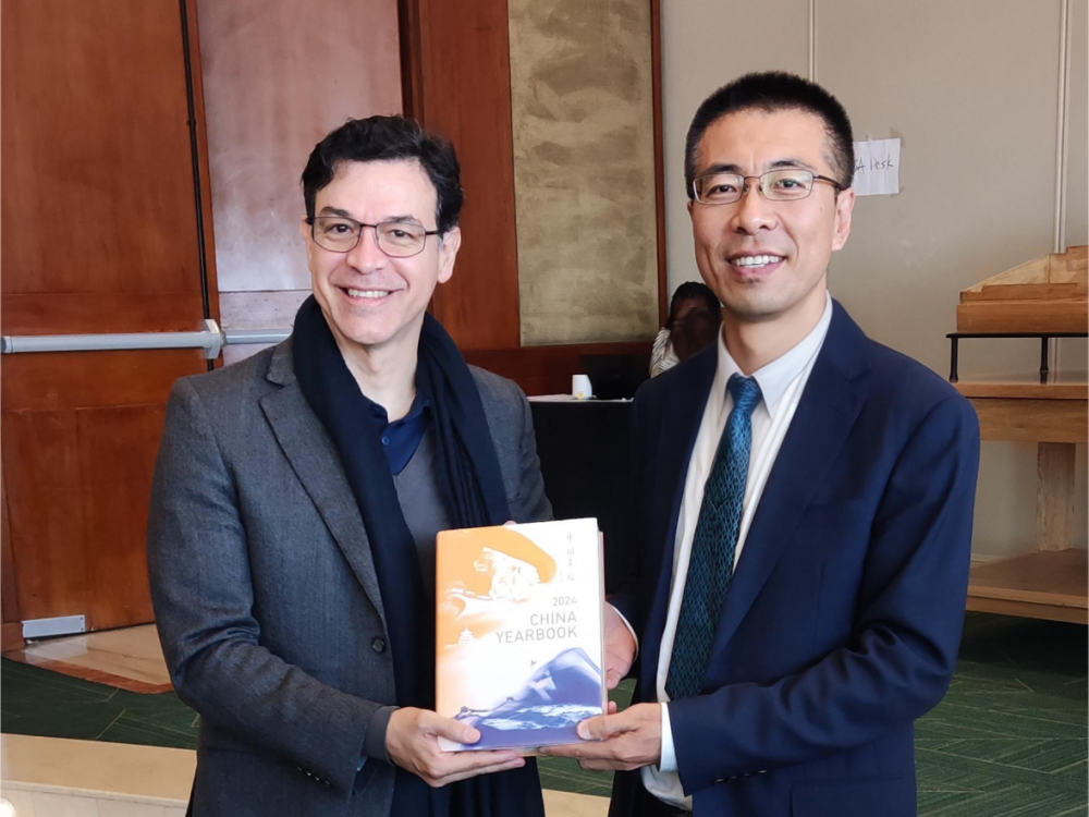 11月1日,在哥伦比亚波哥大,新华指数研究院负责人曹占忠向联合国人居署墨西哥、古巴及中美洲次区域负责人费尔南达·洛纳尔多尼(Fernanda Lonardoni)先生赠送《中国年鉴2024》(英文版)。(杨猛 摄)