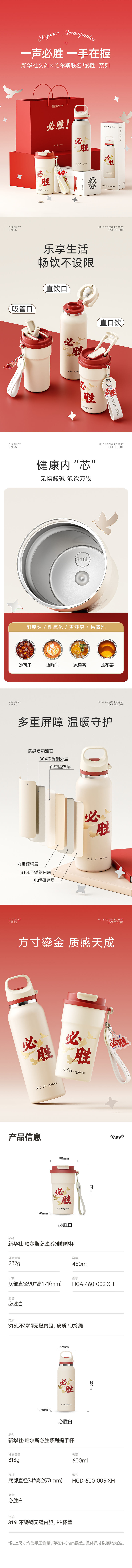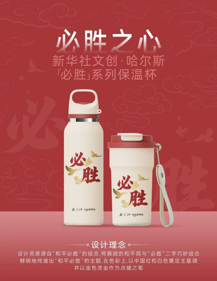 近日,新华社文创与头部杯壶品牌哈尔斯携手推出“必胜”系列杯壶产品,该系列产品的策划灵感,源自纪念中国人民抗日战争暨世界反法西斯战争胜利80周年大会受阅现场划破长空的铿锵口号:“正义必胜!和平必胜!人民必胜!”红白色“必胜”杯壶沿用新华社出图《必胜!》明信片信封上苍劲有力的“必胜”二字,白底红字的搭配,尽显蓬勃朝气。杯壶瓶身上采用金色和平鸽纹样,凝聚着中华民族对和平的孜孜追求。这抹“必胜”印记转化为心底的力量,为身处奋斗路上的人们赋予必胜信念。