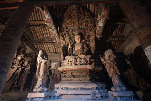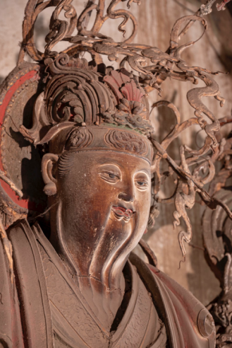 彩塑是原位塑造,还是他处迁移?有人认为,村庙不会有大寺规格的护法神群,二十四诸天是从周边某座大寺院迁移至此;也有人认为,二十四诸天是金大定七年重安佛像时,诸天随之迁移。