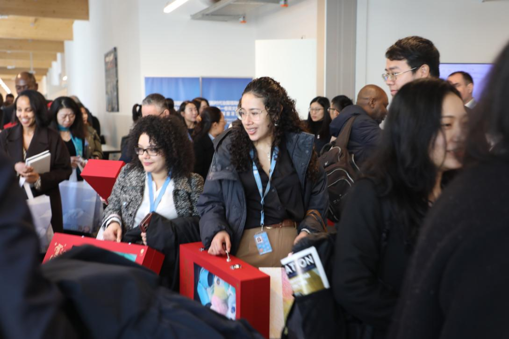 2月24日瑞士日内瓦万国宫活动现场,嘉宾们拿到伴手礼后绽放开心的笑容