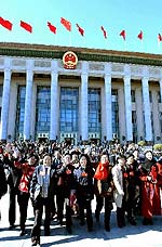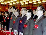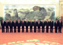 新当选的中共中央政治局常委胡锦涛、吴邦国、温家宝、贾庆林、曾庆红、黄菊、吴官正、李长春、罗干与中外记者见面