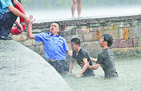 京城学子西湖冒雨救人 记者巧遇记录全程