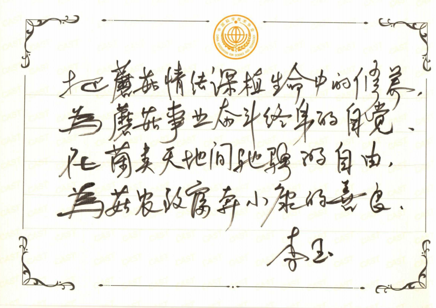 2020年末,中央宣传部、中国科协、科技部、中国科学院、中国工程院、国防科工局等6部门在北京向全社会发布2020年“最美科技工作者”先进事迹。“最美科技工作者”学习宣传活动自2018年以来已连续举办3届,每年选树10位先进个人。王行环、李玉、陈厚群、胡郁、李东、陈亮、仝小林、次旦央吉、程相文、郝吉明荣获2020年度“最美科技工作者”称号。以上为李玉的寄语。