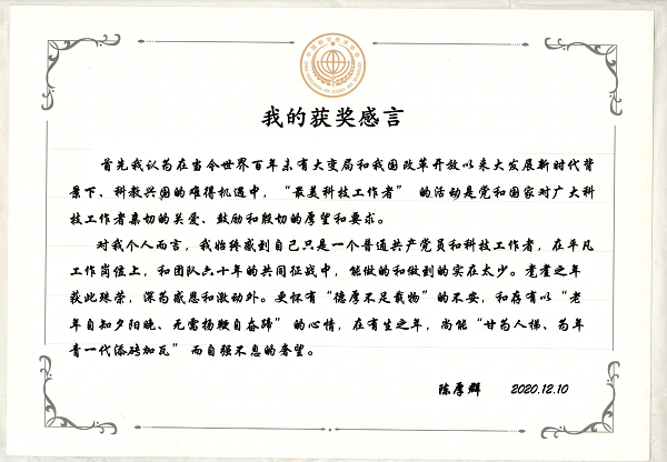 陈厚群获得“最美科技工作者”的称号,他认为这个活动对科技工作者不仅是鼓励爱护,也是一种期盼、愿望和要求。“一个意义是在于充分体现了我们党和国家对广大的科技工作者的关心爱护和鼓励,所以这些荣誉并不只是给这几个得到称号的同志,而是面向我们广大的科技工作者。还有不仅是鼓励爱护,也是意味着一种期盼、愿望和要求。就是希望我们广大科技工作者,能够在当前难得的历史机遇期,能够有很好的发现,发挥科技创新的巨大作用。我觉得它的意义就在这里。”