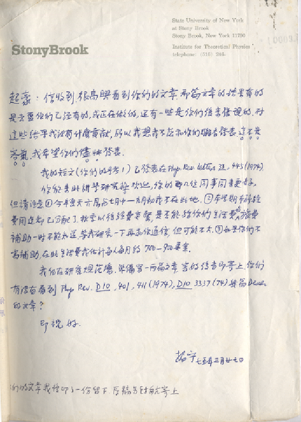 1974年起,谷超豪应杨振宁的合作邀请开展了规范场理论方面研究,并很快取得成果。图为1975年3月27日,杨振宁教授致谷超豪教授信。