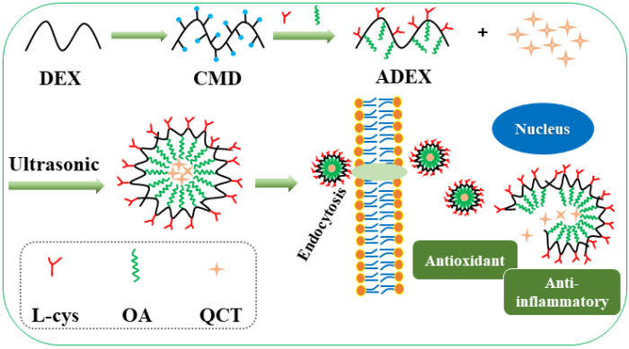 图1 两亲性葡聚糖和载药纳米胶束的合成机理;载药纳米胶束的抗炎和抗氧化作用。