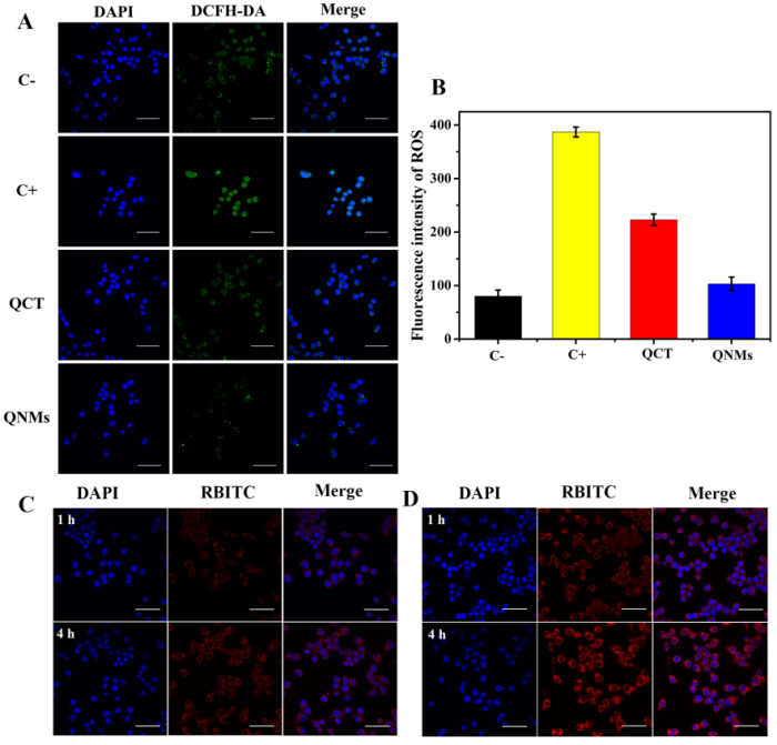 图2 QCT和QNMs对 LPS 诱导的 RAW264.7巨噬细胞中 ROS 产生的影响(A、B);RAW264.7 巨噬细胞对QCT(C)和QNMs(D)的细胞摄取结果。