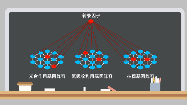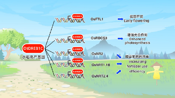 植物的性状是由很多基因相互作用形成的,一个性状就有一个基因阵容,像是一个系统的通路。而新发现的水稻高产基因OsDREB1C是一个转录因子,它就像是一个“分子开关”,在这个通路的最上面,下面有控制光合作用、氮素吸收利用以及开花等途径的很多基因,这个基因的表达量提高以后,通过基因调控的网络,把下游的光合作用基因、氮吸收高效利用基因以及影响抽穗期的基因都启动了,从而协同调控水稻的光合效率、氮素利用效率以及抽穗期。
