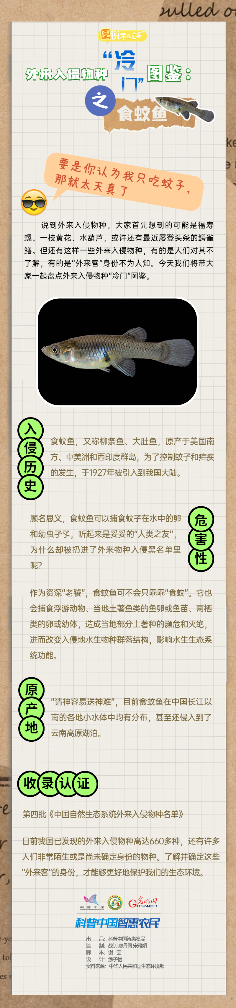 编者按:说起外来入侵物种,大家可能最先想到巴西龟、一枝黄花等等。但还有一些外来入侵物种,其“外来客”的身份很少有人了解。今天,我们将带大家一起盘点外来入侵物种“冷门”图鉴,一起来认识并非只吃蚊子的食蚊鱼。