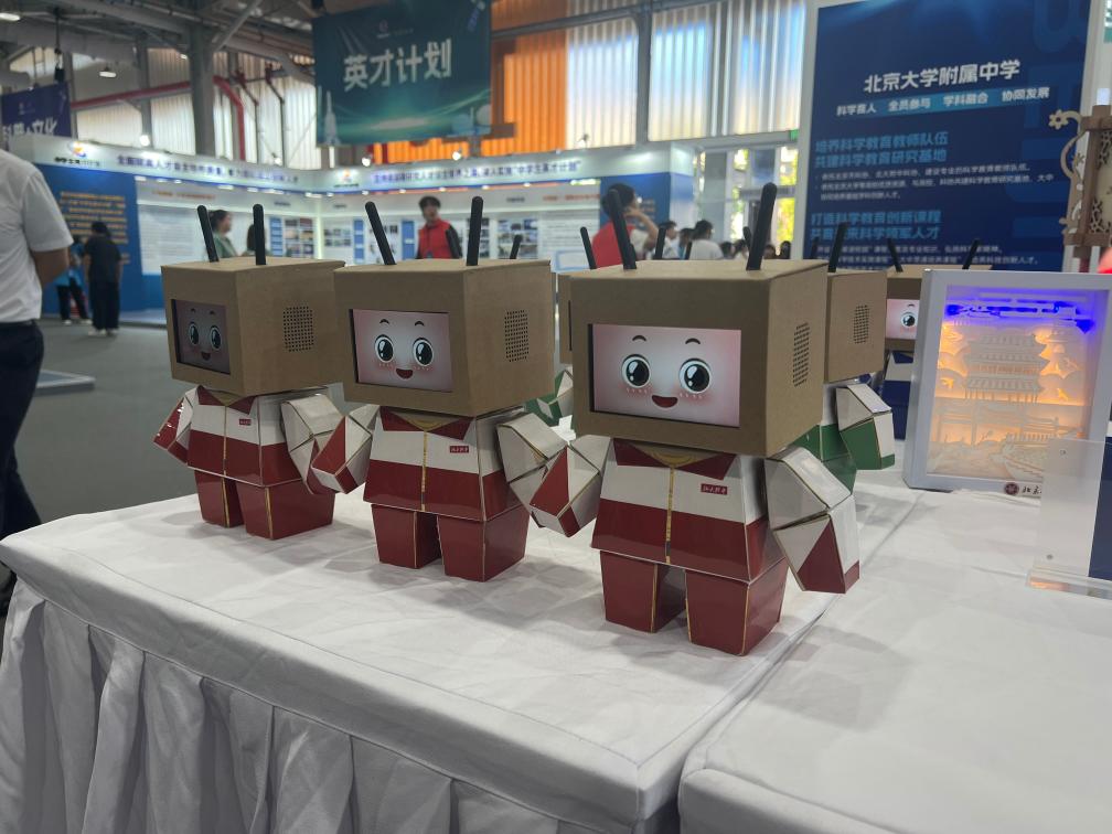 北京大学附属中学的同学们带来了他们研发制作的舞蹈纸壳机器人。这些身着校服的瓦楞纸机器人一边喊出“少年强则国强”,一边做着律动。