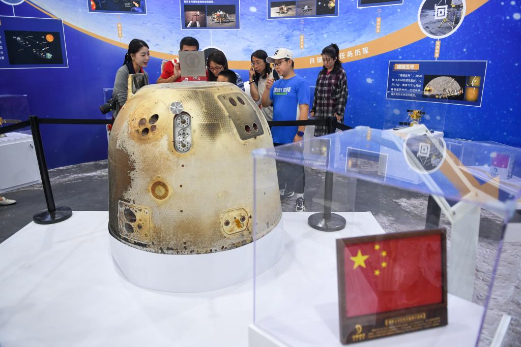 9月17日,在全国科普日北京主场活动展区,参观者参观展出的嫦娥五号再入返回飞行试验任务返回器。新华社记者鞠焕宗 摄