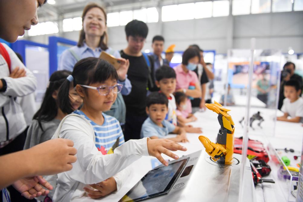 9月17日,在全国科普日北京主场活动展区,小朋友体验与一款机器手进行动作同步。新华社记者鞠焕宗 摄