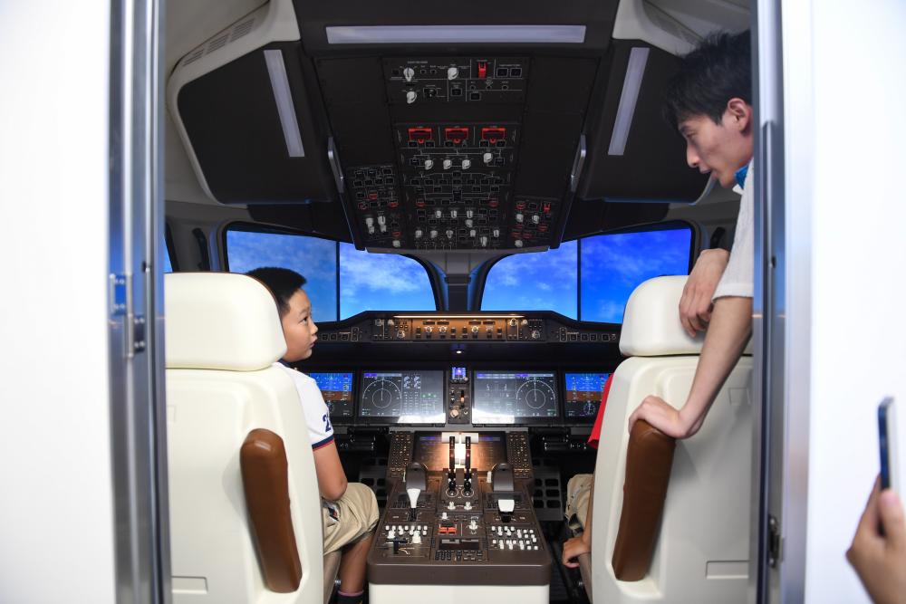 9月17日,在全国科普日北京主场活动展区,两名小朋友在体验C919模拟驾驶器。新华社记者鞠焕宗 摄
