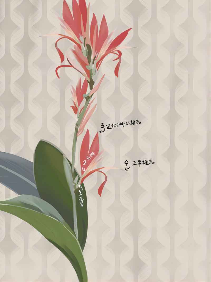 没有退化的能育雄蕊只有一枚,长得像撕去一半的花瓣,花药附着于其侧面。花瓣式样的雄蕊下藏有一把“圆月弯刀”,这是雌蕊的变异,薄薄的扁扁的“刀片”确切地说是花柱,花柱下的花冠深处藏有蜜汁,家在南方的朋友或许都有小时候偷摘美人蕉的“弯刀”吮吸花蜜甘露的回忆。