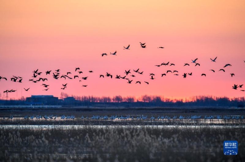 资料图片:候鸟从吉林省白城市镇赉县莫莫格国家级自然保护区上空飞过
