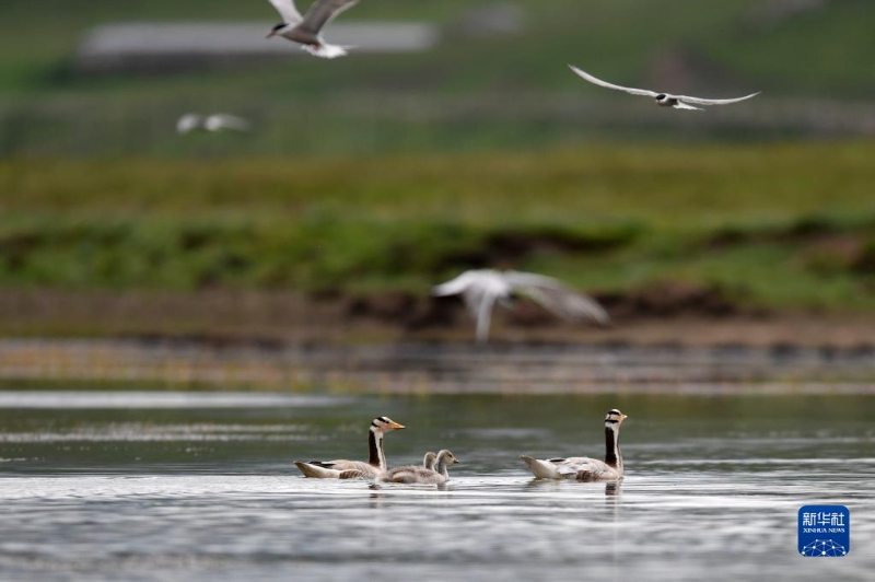 斑头雁在尕海湿地的水面上游弋