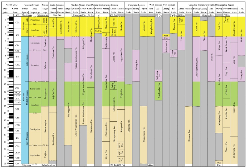 该研究将青藏高原及其邻区的新生代盆地划分为5个地层区,即南疆-西昆仑区、柴达木-祁连-西秦岭区、羌塘区、滇西-川西区、冈底斯-喜马拉雅-西瓦立克区,并可进一步细分为次一级的地层小区。在生物地层和磁性地层的约束下,以地质年代为框架,青藏高原及其周边各地层分区的岩石地层单位得到精细对比。
