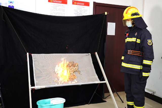 图四:消防员在展示柳絮点燃实验。(来源:新华社)