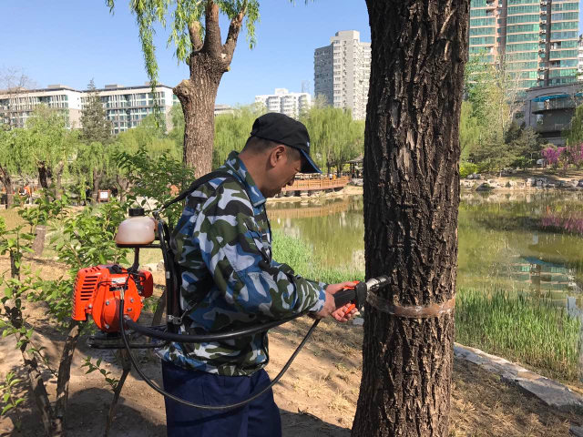 图七:北京园林局工作人员在给一棵柳树雌株注射药物抑制飞絮(来源:新华网)