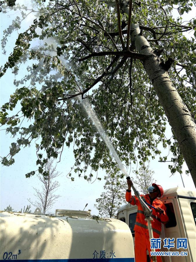 图六:在北京丰台区,一名工作人员用高压水枪对杨树雌株进行喷水湿化以减少飞絮。(来源:新华社)