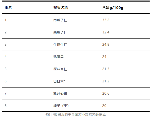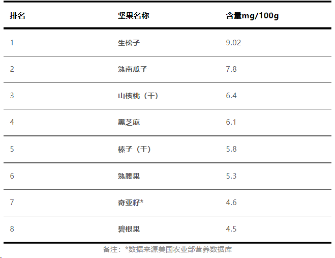 锌在生长发育、维持免疫、生殖健康等方面具有重要作用,生松子、熟南瓜子、山核桃的锌含量在坚果中算不错的。