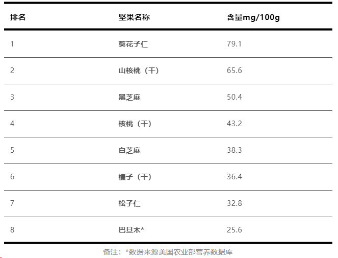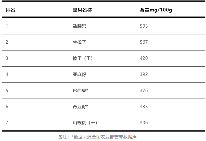 充足的镁摄入对骨骼健康、血压健康以及心血管健康都有益。吃10克熟腰果、生松子或榛子,就能满足一般人群每天镁需求量的15%左右了。