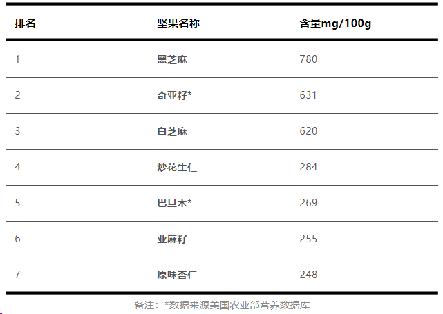饮食中充足的钙摄入能增强骨质,预防骨质疏松。虽然坚果中的钙吸收率不如牛奶,但仍然对补钙有些帮助。黑芝麻、奇亚籽、白芝麻钙含量还算丰富。
