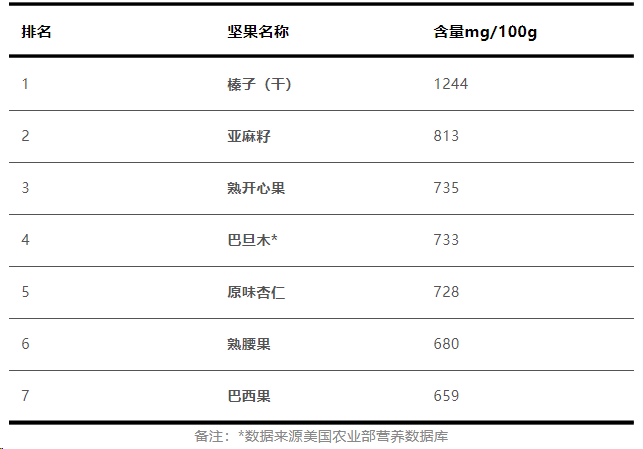 硒属于抗氧化剂,具有免疫调节功能,缺硒不仅会降低免疫力,还可能会诱发某些甲状腺疾病。巴西果的硒含量高的惊人,我们对硒的需求量是60微克/天,吃1颗(大约5克)就能摄入96微克,可满足一般人群每日硒需求量的160%。