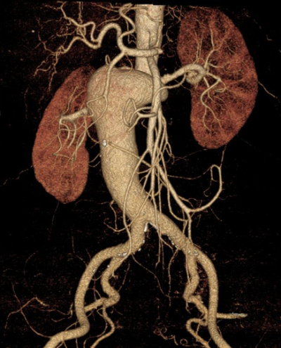 更精确的检查手段主要是CT血管造影,通过CT可以判断动脉瘤累及的范围、直径以及是否瘤体上下两端尚有正常的血管,这决定了动脉瘤可选择的治疗手段。