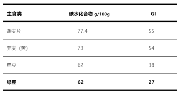 绿豆属于杂豆类,与大米、小米、燕麦等类似,在饮食上主要充当主食。不过,和其他主食相比,绿豆的碳水化合物低,而且升血糖的速度也比较慢,血糖生成指数只有 27(低于 55,属于低 GI 食物),与其他谷物熬得汤相比,很适合糖友饮用。GI 的高低与膳食纤维含量、淀粉类型等都有关系。
