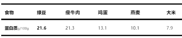 绿豆作为杂豆类,拥有高含量的蛋白质,蛋白质含量高达 21%~28%,是蛋类的2倍,可以与肉类相媲美。