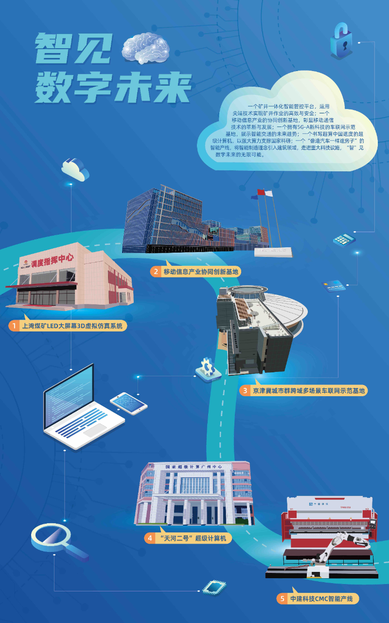一个矿井一体化智能管控平台,运用尖端技术实现矿井作业的高效与安全;一个移动信息产业的协同创新基地,彰显移动通信技术的革新与发展;一个拥有5G-A新科技的车联网示范基地,展示智能交通的未来趋势;一个书写超算中国速度的超级计算机,以强大算力支撑国家科研;一个“像造汽车一样造房子”的智能产线,将智能制造理念引入建筑领域,走进重大科技设施,“智”见数字未来的无限可能。