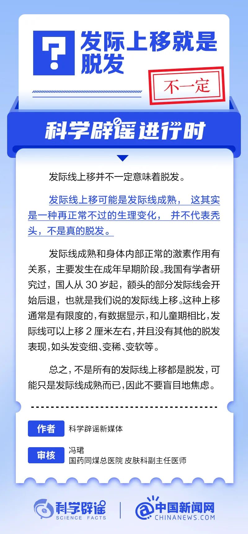 发际线上移可能是发际线成熟,这其实是一种再正常不过的生理变化,并不代表秃头,不是真的脱发。发际线成熟和身体内部正常的激素作用有关系,主要发生在成年早期阶段。这种发际线上移通常是有限度的,有数据显示,和儿童期相比,成年后发际线可以上移2厘米左右。