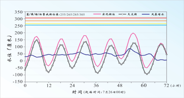 2023年7月28日“杜苏芮”台风风暴潮发生时,福建东山站实测潮位、天文潮和风暴增水随时间变化情况,图中清晰地反映出风暴潮与天文潮叠加后,实时潮位明显升高。(资料来源:《2023中国海洋灾害公报》)