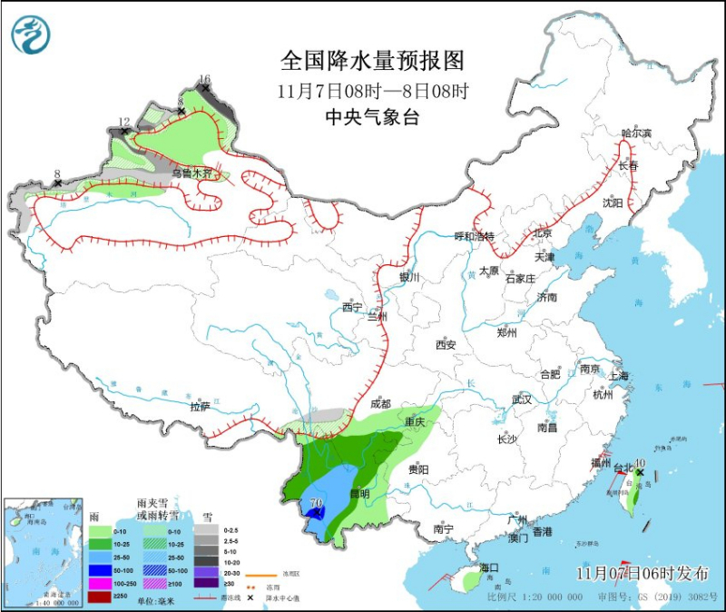 立冬日全国降水量预报,灰色区域为降雪地区(图片来源:中央气象台)