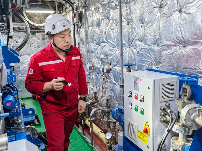 有些机器白天黑夜连轴转,确保它们安全运行是轮机员的重要工作。机舱空间大,布局复杂,走起来像一座迷宫。祖成弟熟练地穿行其间,时不时摸摸机器温度,记录相关数据。