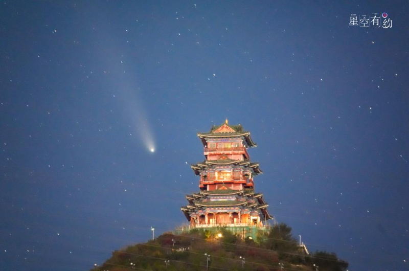 2024年10月22日在北京门头沟区拍摄的紫金山-阿特拉斯彗星与定都阁同框。(王俊峰摄)