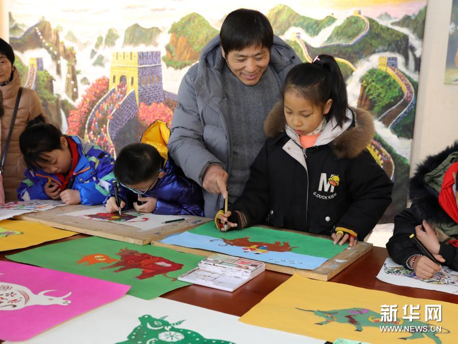 2021年1月4日,在浙江省诸暨市陶朱街道三都农民画馆,农民画家指导三都小学美术社团学生画农民画。。
