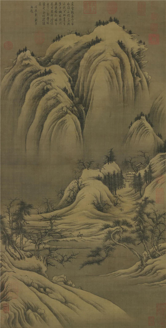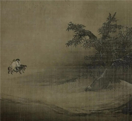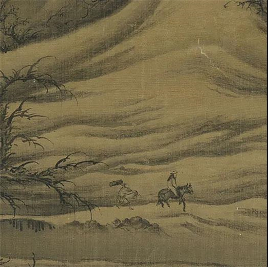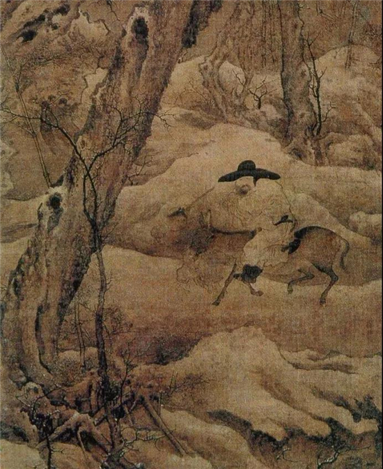 李成的《寒林骑驴图》是宋画中罕见的大立轴。画的是白雪寒冬,长松之下,一文人骑驴行于郊野,前后有童仆相随。画面只有近景和中景,远景则掩于古松之后,未着一笔,却气象萧瑟,境界幽深。在刻意营造的荒寒冷寂中,却有嫩枝环绕苍松,严寒之下仿佛孕育着无限生机。现藏于美国大都会艺术博物馆。